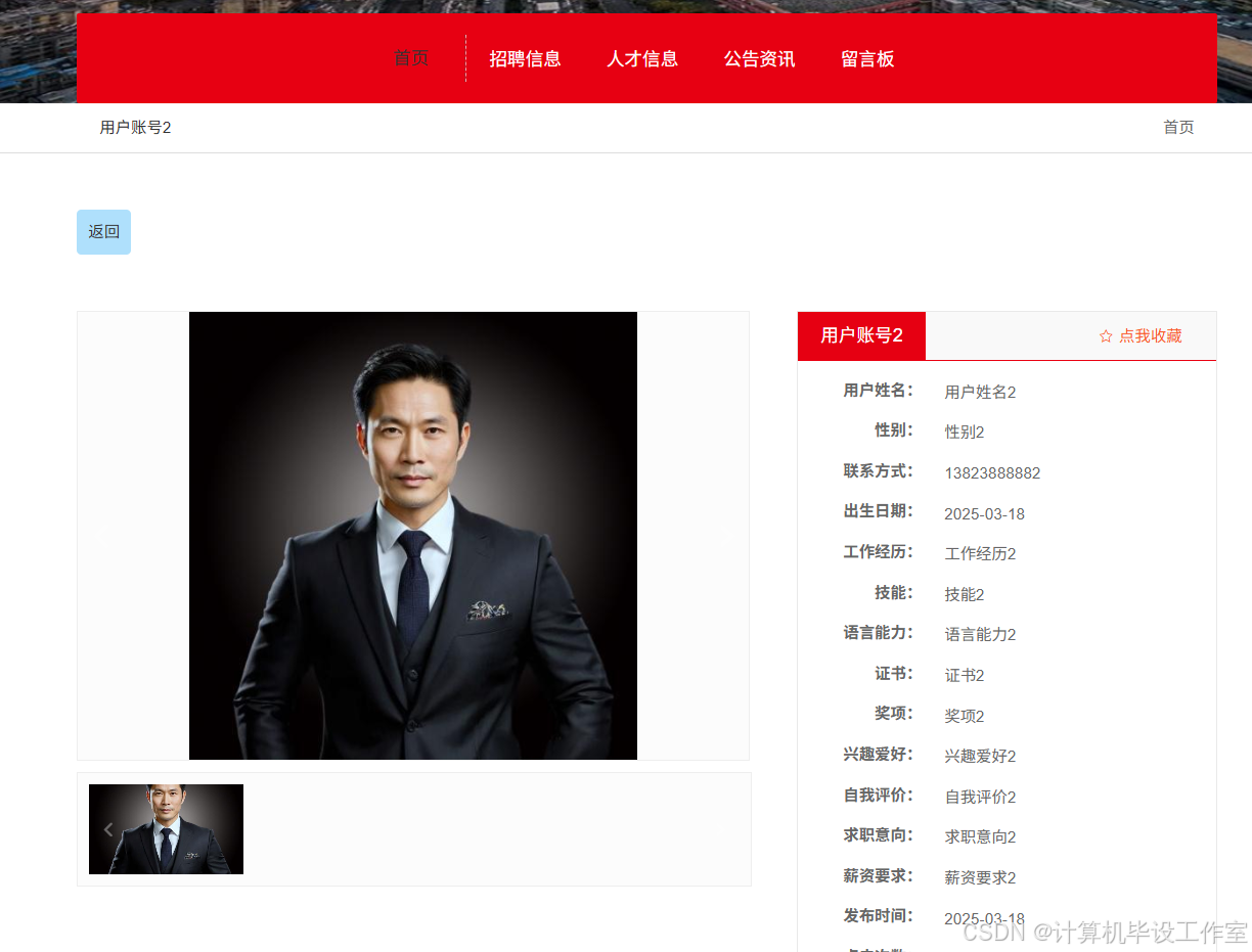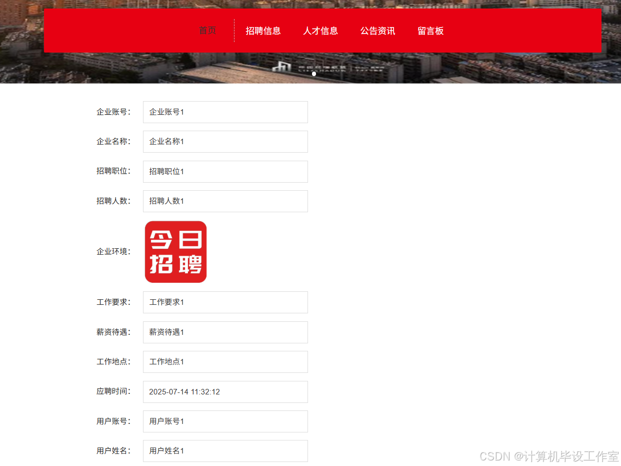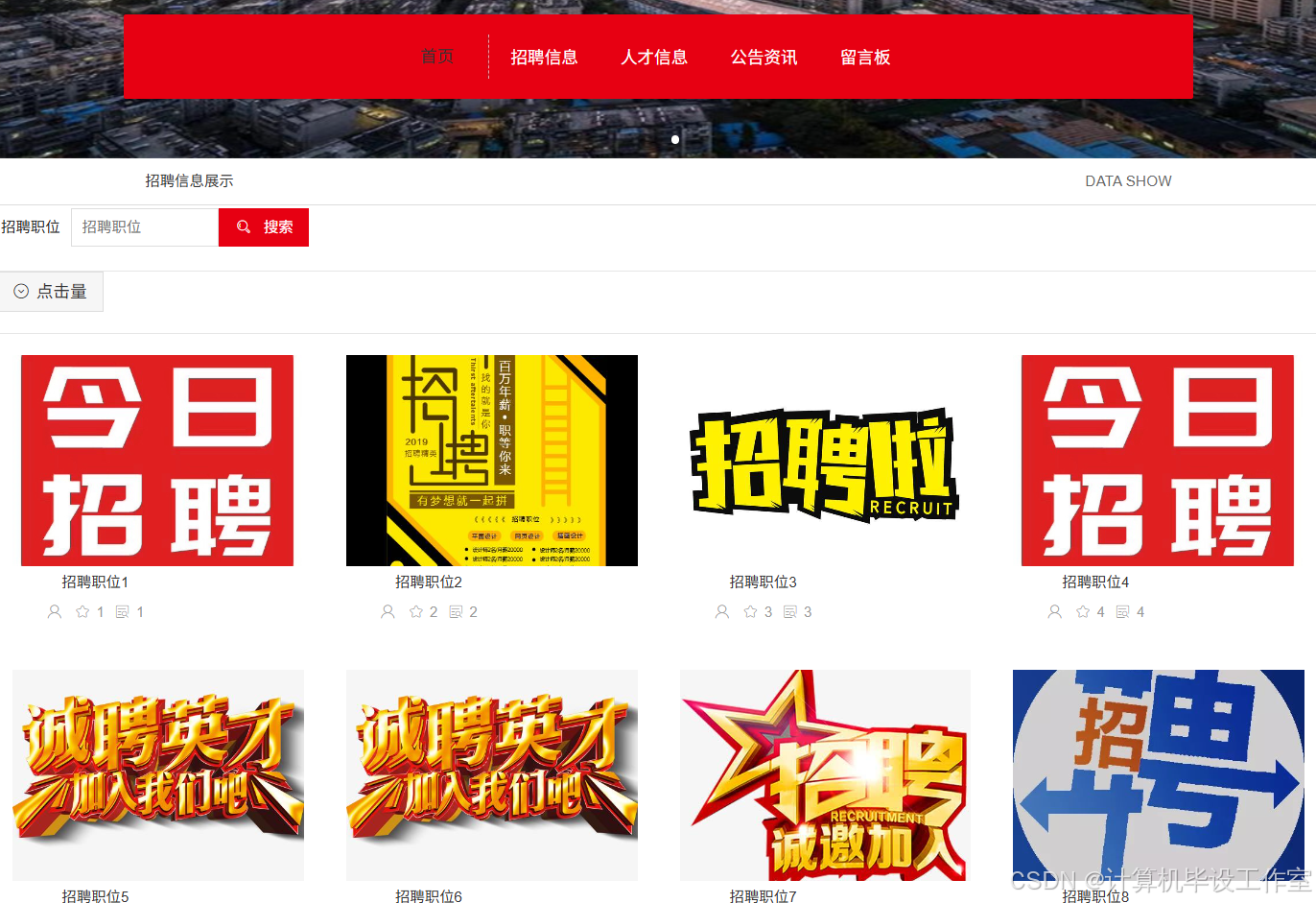 - 首页:用户登录系统后跳转至首页界面,导航栏下面依次是轮播图、公告资讯、留言板、招聘信息等。