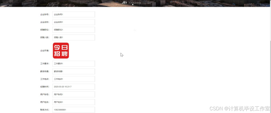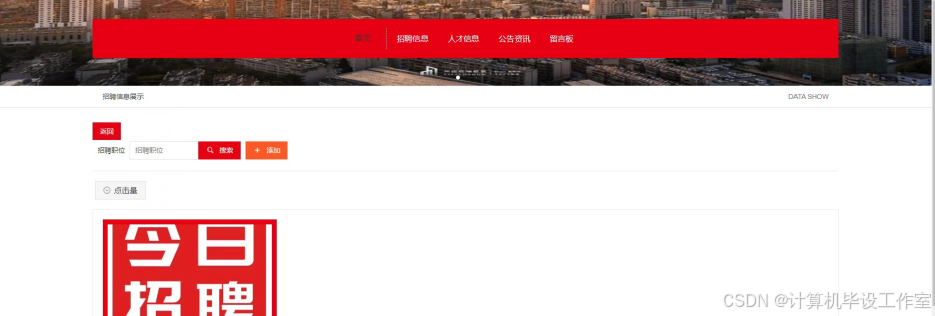 - 招聘信息:企业用户点击招聘信息界面后可以进行企业具体招聘岗位需求进行添加和发布。