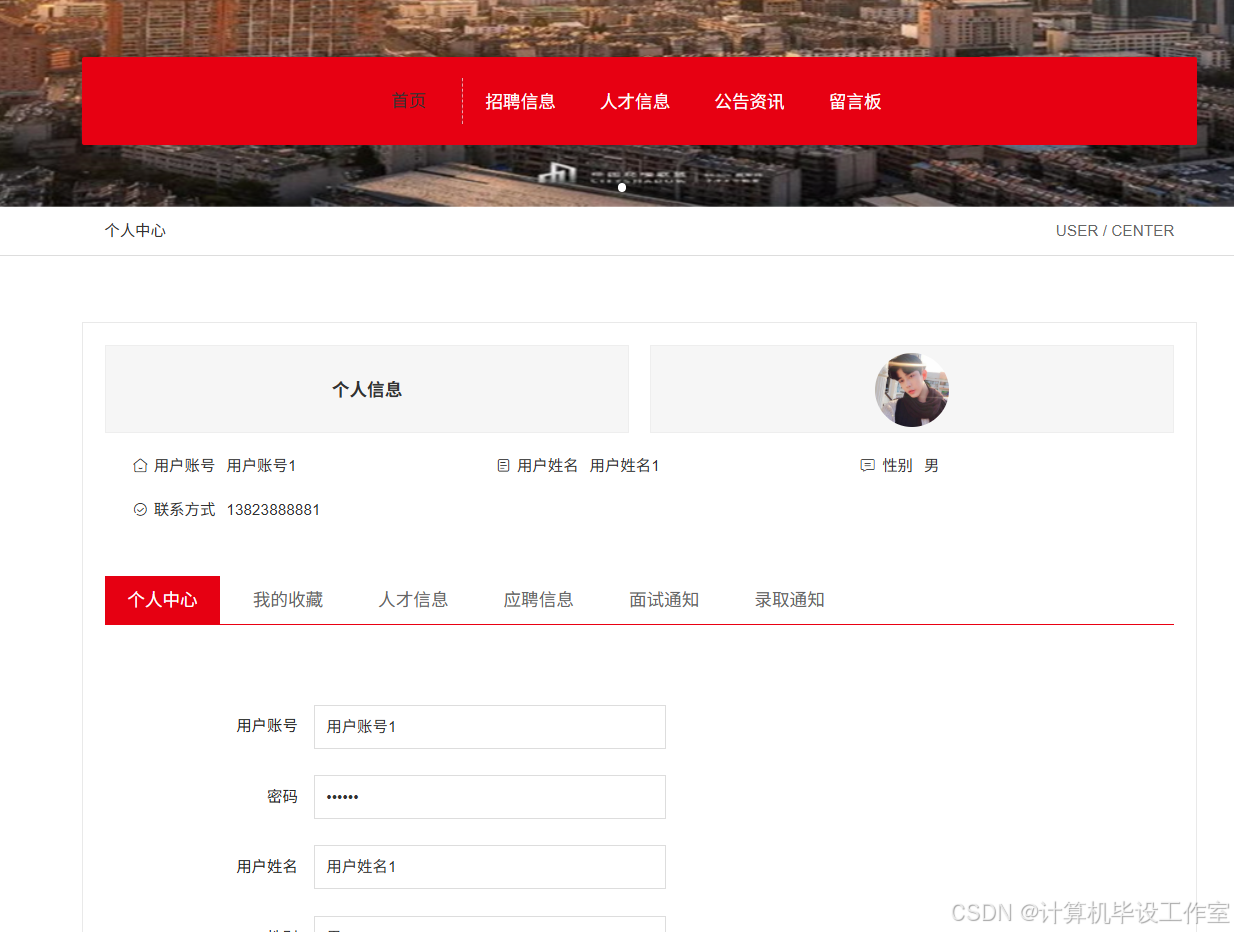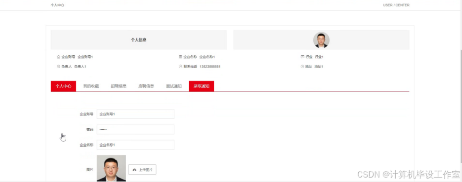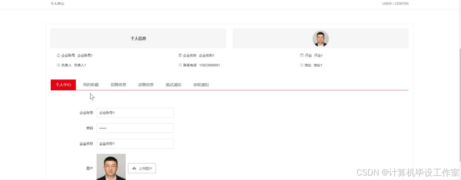人才招聘系统中的企业用户登录系统后,点击“个人中心”进行企业用户的个人资料和登录密码的修改。界面如下图4-8所示。