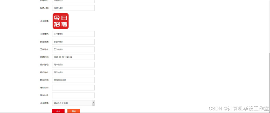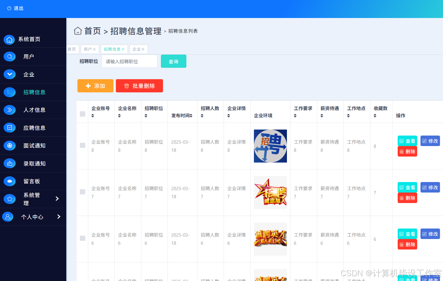 - 应聘信息:查看和管理用户递交的职位应聘申请。