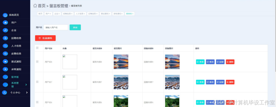 管理员在“留言板”这一菜单中是可以对人才招聘系统内所有的用户的留言信息进行查看以及回复操作,界面如下图4-13所示。