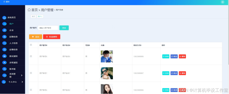 人才招聘系统中的管理员登录系统后,点击“用户”可以对所有前端注册的新用户信息进行维护管理。界面如下图4-12所示。