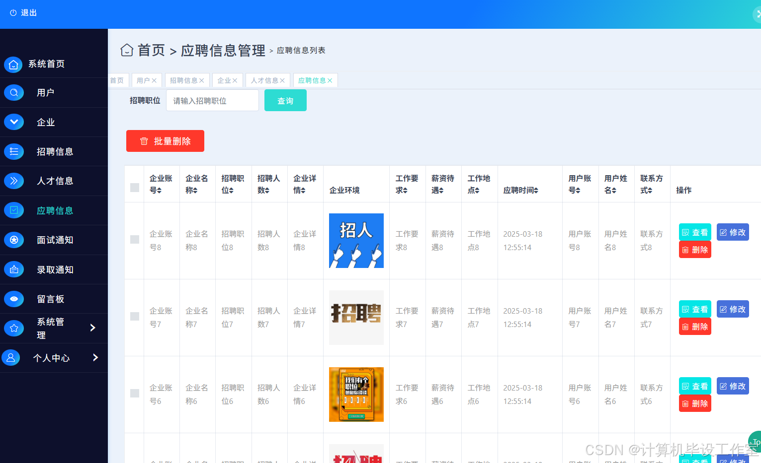 (6)应聘信息:查看和管理用户递交的职位应聘申请。