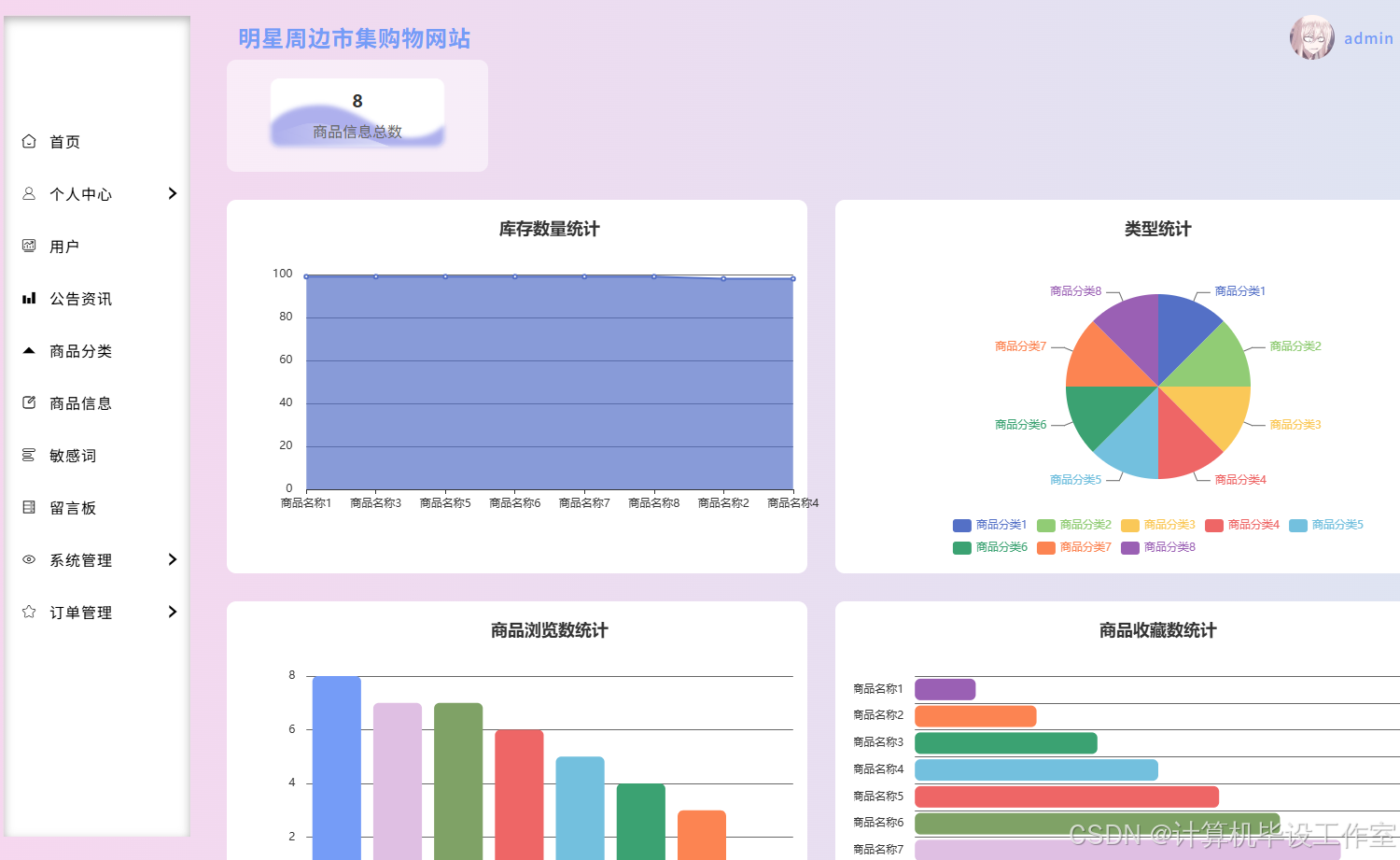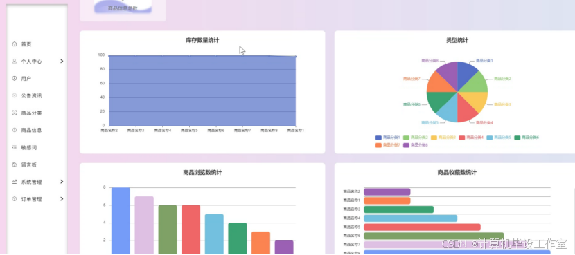 管理员可以通过图形方式将数据统计展示,比如库存数量统计、类型统计、商品浏览数统计、商品收藏数统计等。
