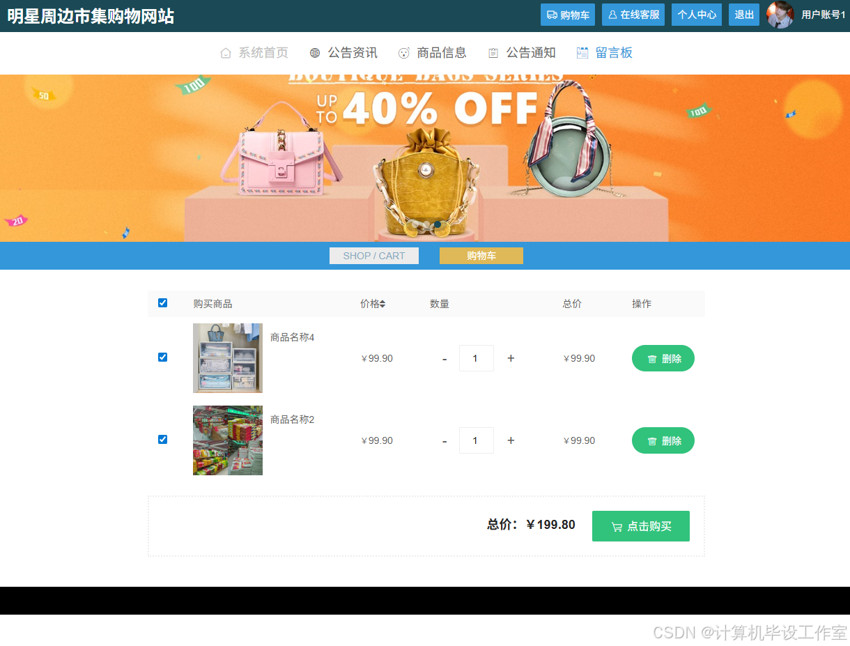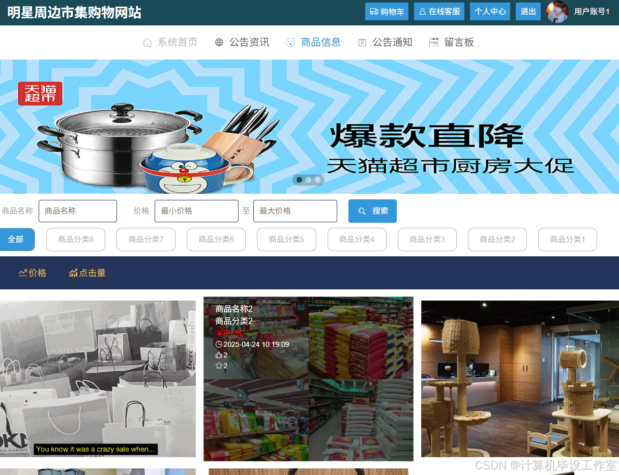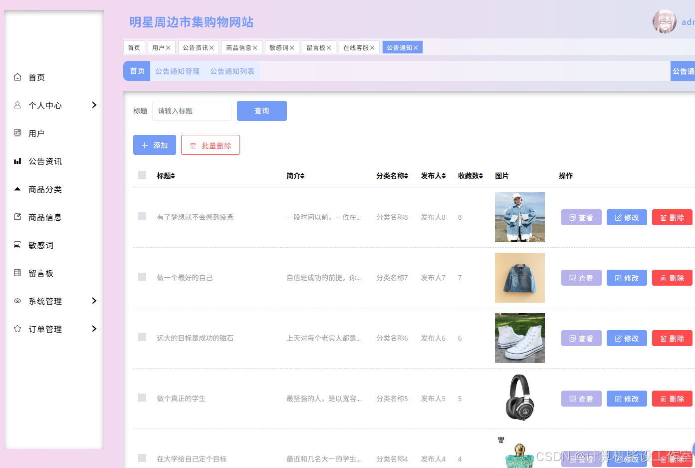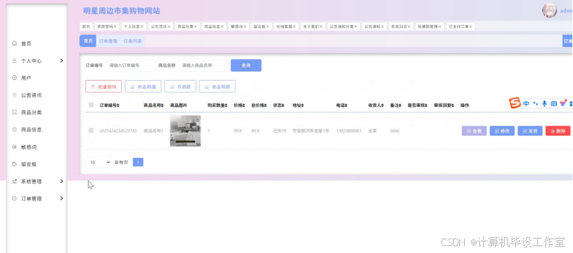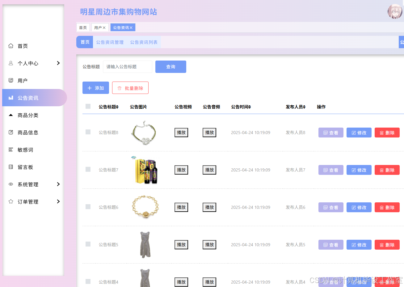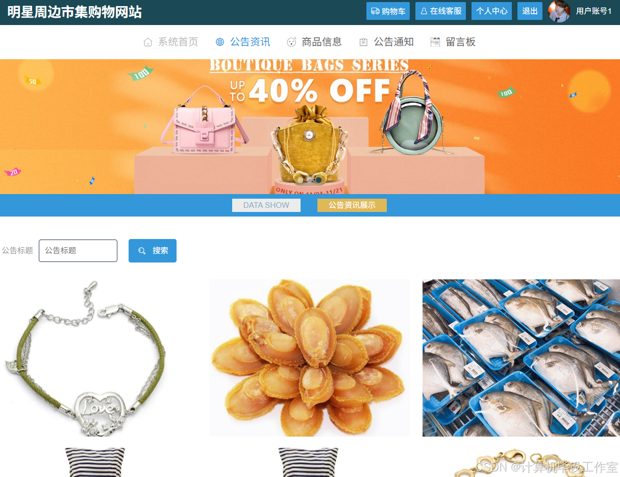 明星周边市集购物网站通过集中展示明星周边产品、提供便捷的购物流程以及丰富的互动功能,为用户提供一站式的购物体验。网站采用Java作为后端开发语言、框架使用SSM,结合MySQL数据库进行数据存储和管理。此网站具备多项核心功能,包括公告资讯、公告通知、留言板、商品信息展示以及订单管理等。这样的系统有望成为连接明星、品牌和粉丝的重要桥梁,推动整个明星周边市场的健康发展。