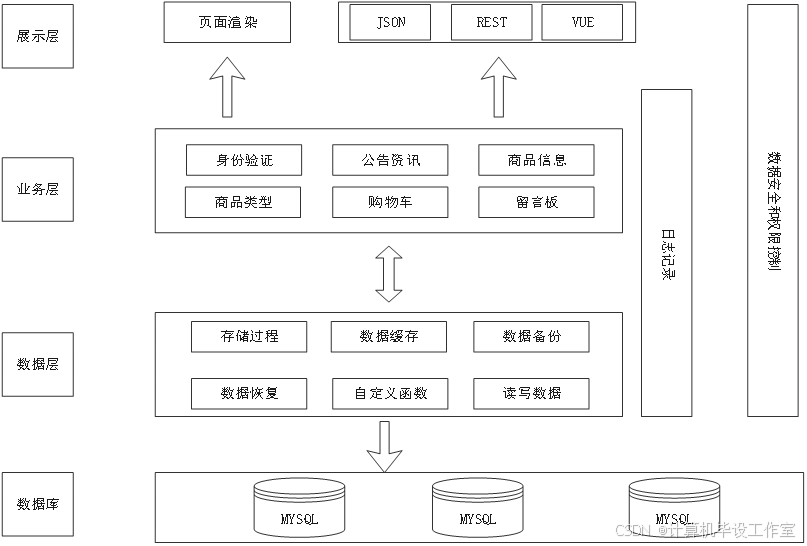 基于Java的明星周边市集购物网站的架构分为展示层、业务层、数据层与数据库四个部分,每个部分都有其独特的作用。展示层主要负责用户界面的设计和交互逻辑,采用前端技术Vue框架构建,提供商品列表、公告资讯、购物车、订单状态等信息的显示,提升用户体验。