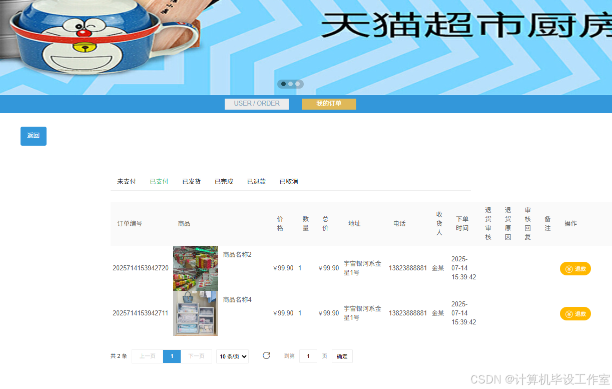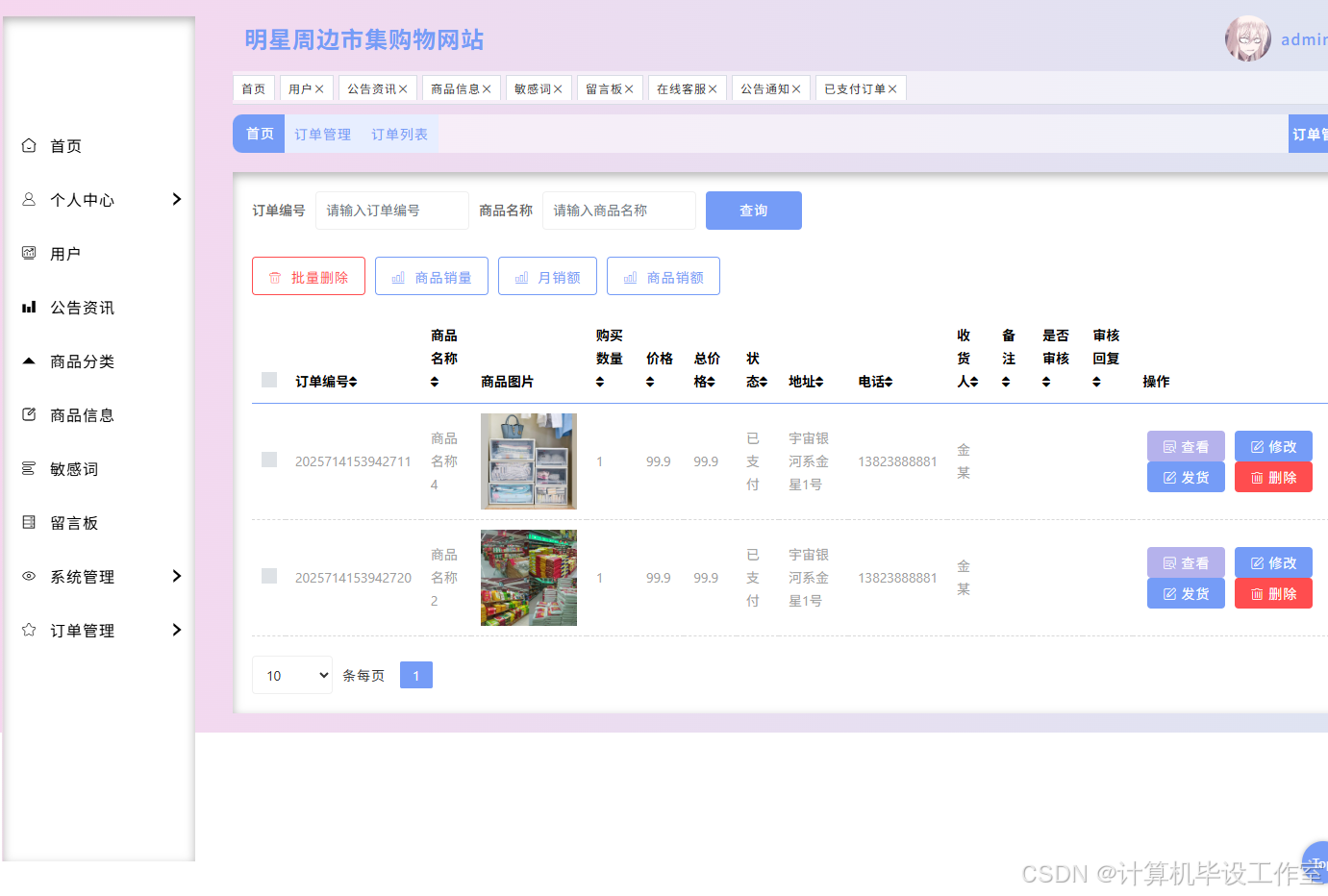 管理员通过管理订单功能,可以处理平台中所有的订单数据。包括已支付、已发货、已退款、未付款、未发货等订单。