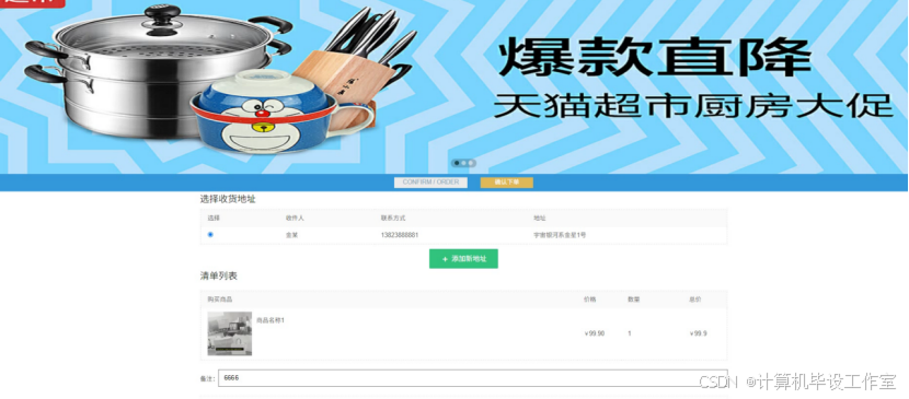 (4)购物车:添加购物车后,用户可以核对订单详情,包括商品、数量、价格等,进行确认下单,在地址界面输入收货地址以及联系人方式等保存,订单后续将会按照具体要求配送。