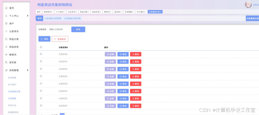 - 系统管理:包括了在线客服内容、轮播图、系统简介、公告资讯内容等,管理员有权限对这个板块内容进行管理。