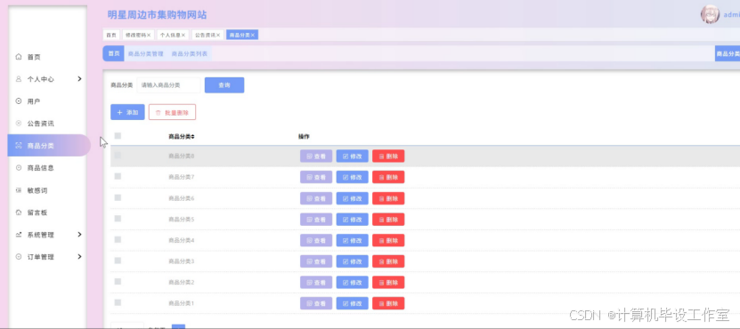 管理员点击商品分类界面后,能够添加商品分类、修改分类、删除分类等,对商品进行分类管理主要便于前端用户进行某种品类的商品进行搜索。