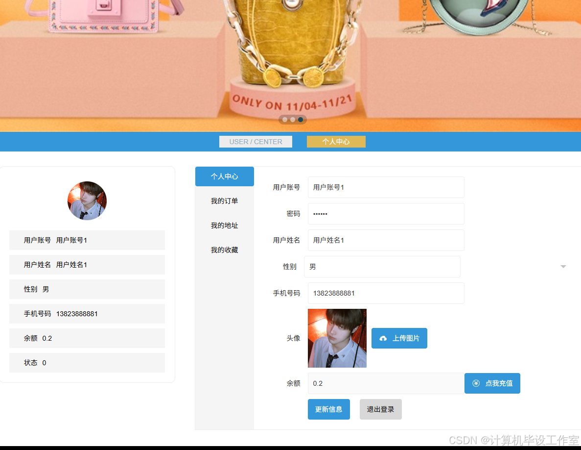 - 个人中心:包括了个人资料的修改、密码的重置;在线客服沟通;查看订单信息等。