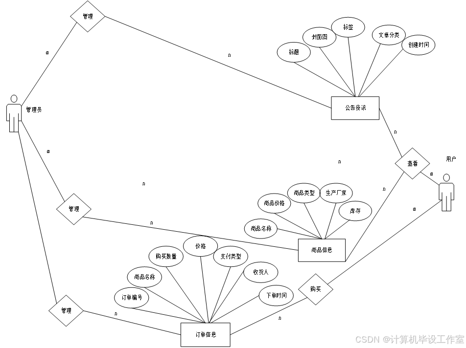 概念设计是数据库设计的第一步,其主要目标是对系统的数据需求进行全面的理解和抽象。在这一阶段,通过建立实体-关系模型(ER模型)来识别系统中的关键实体、属性及其相互关系。概念设计的输出是一个清晰的ER图,作为后续数据库表设计的基础。以下将展示系统的全局E-R图以及各个实体的属性图。