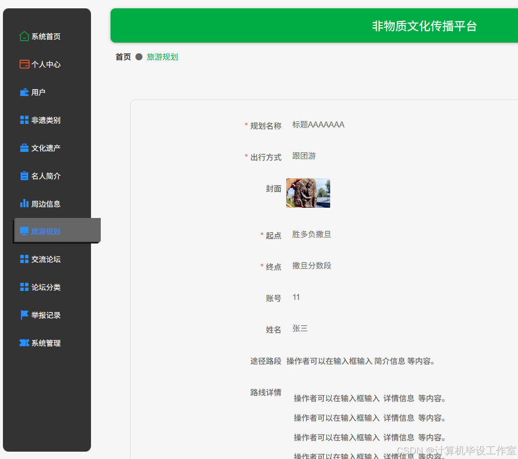 (9)旅游规划:管理员可以查看用户定制的个人旅游规划信息。
