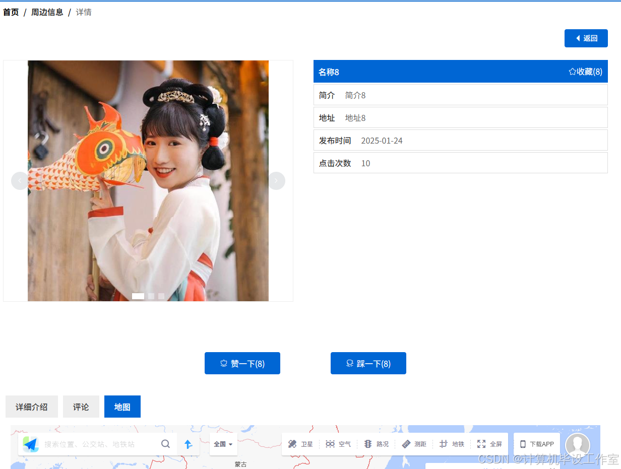 当用户点击非物质文化传播平台中导航栏上的“周边信息”后可以查看各种周边详情,可以点击地图进行查看。周边信息界面如下图5-7所示。