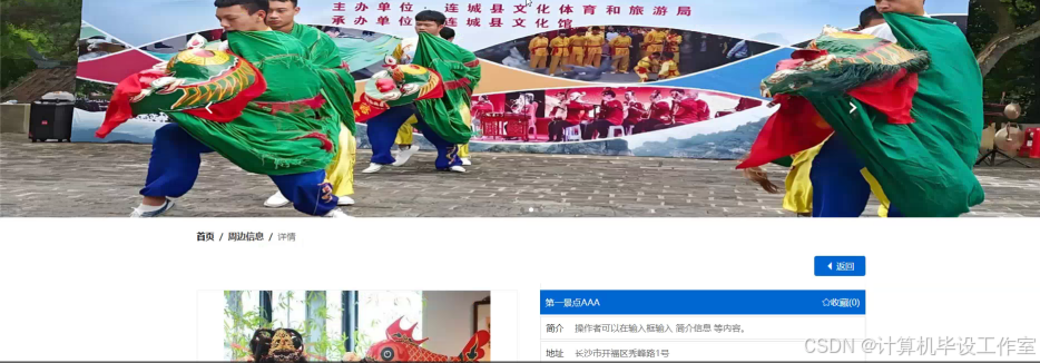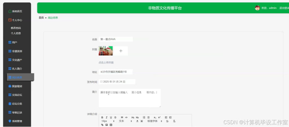管理员可以添加、编辑或删除周边信息,包括名称、封面、地址、简介、详细介绍以及发布时间等。周边信息界面如下图5-13所示。