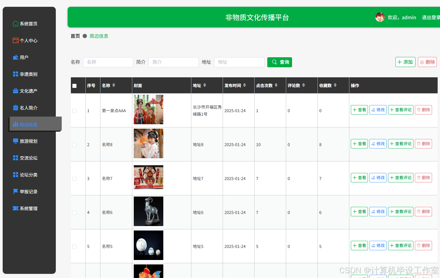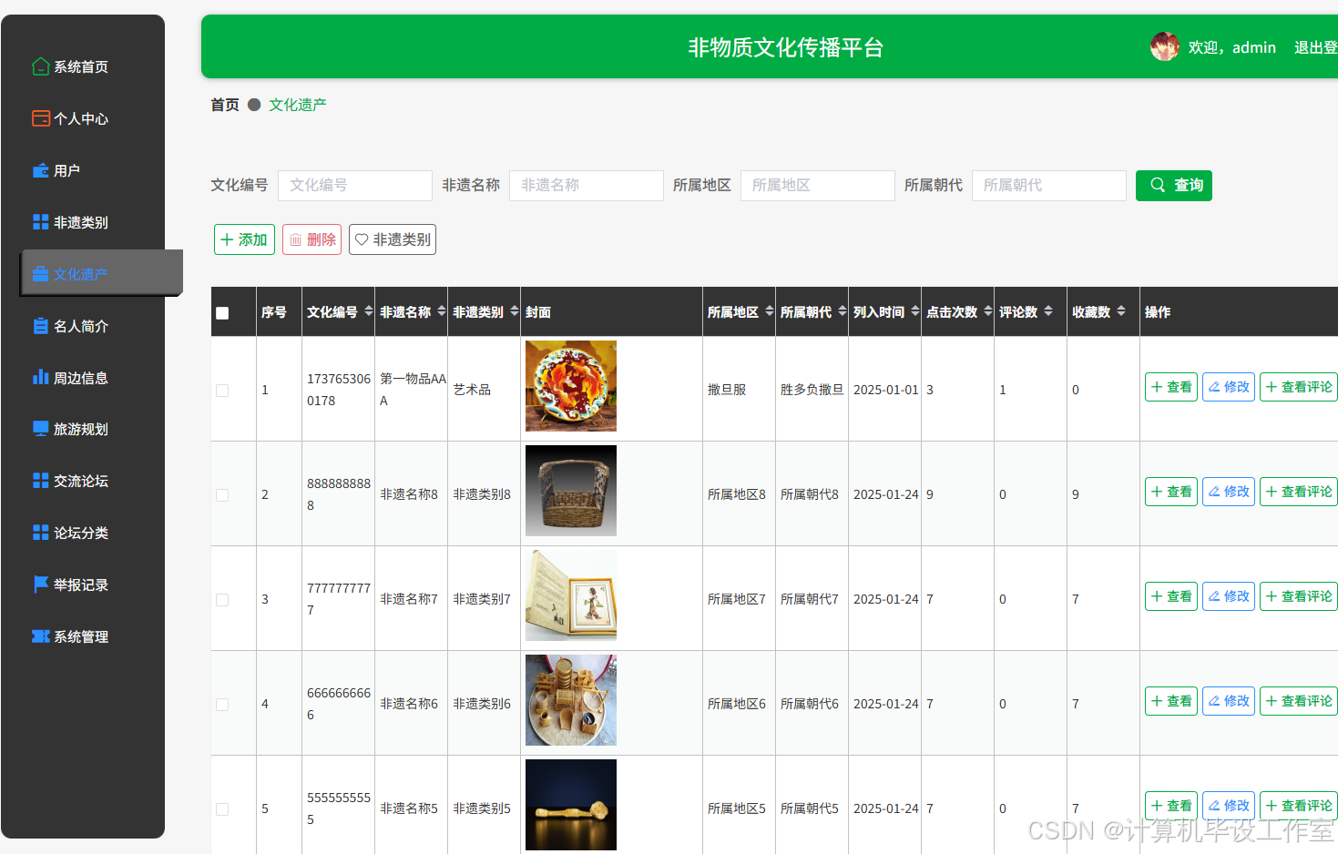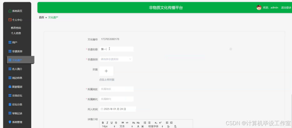 (4)文化遗产:管理员可以在此模块对系统展示的文化遗产信息进行增删改查。