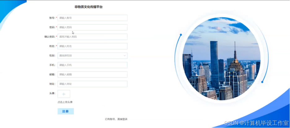 非物质文化传播平台的用户需要操作系统功能模块的前提是进行注册,用户注册需要输入账号+密码+姓名+手机等内容点击注册按钮即可完成注册。系统用户注册界面展示如下图5-2所示。