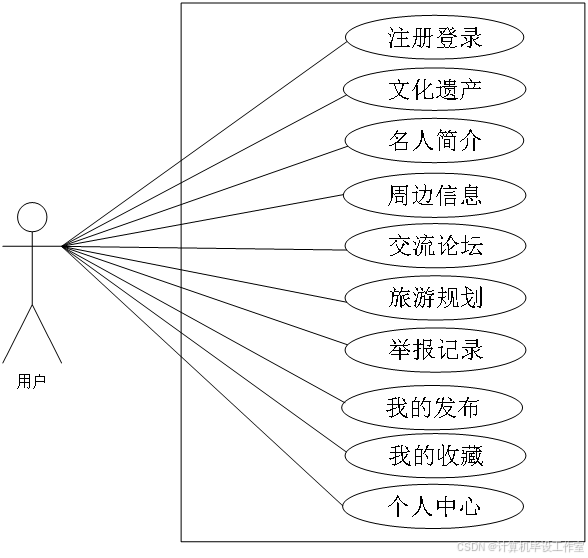 1.用户的主要功能有注册登录、文化遗产、名人简介、周边信息、交流论坛、旅游规划、举报记录等。