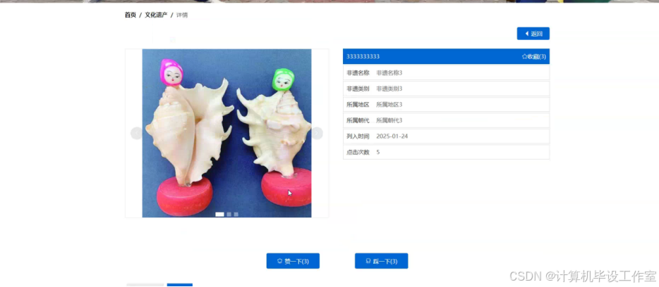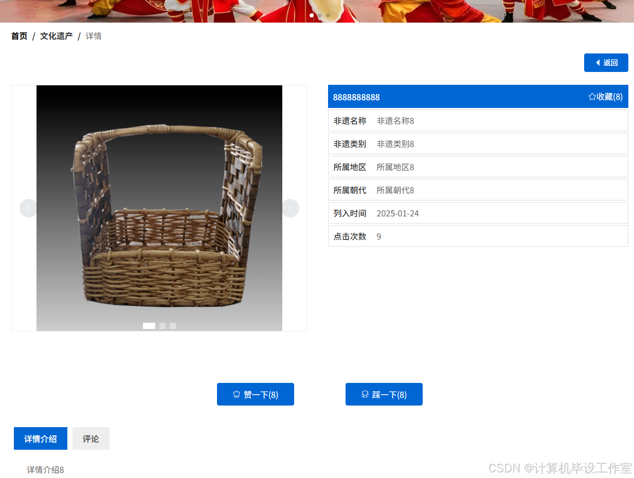 当用户点击非物质文化传播平台中导航栏上的“文化遗产”后可以查看各种文化遗产详情,了解非遗名称、非遗类别、所属地区、所属朝代、列入时间等,在界面中可以评论+收藏+点赞操作。文化遗产界面如下图5-5所示。