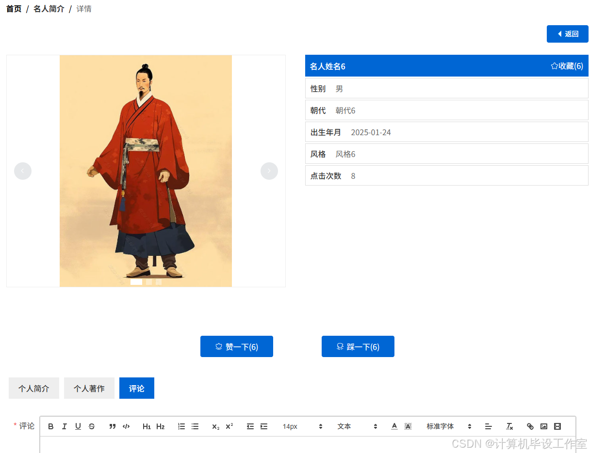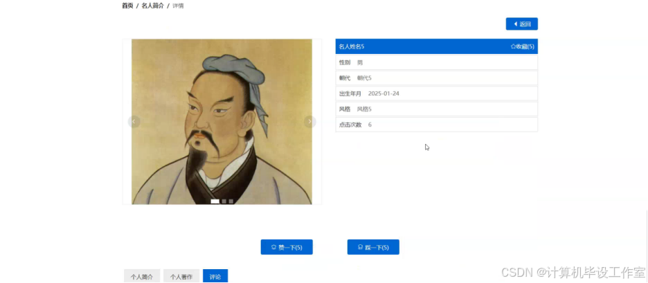 用户可以通过系统界面端的“名人简介”了解名人姓名、性别、朝代、出生年月、风格等详情,可以进行点赞、收藏、评论操作。