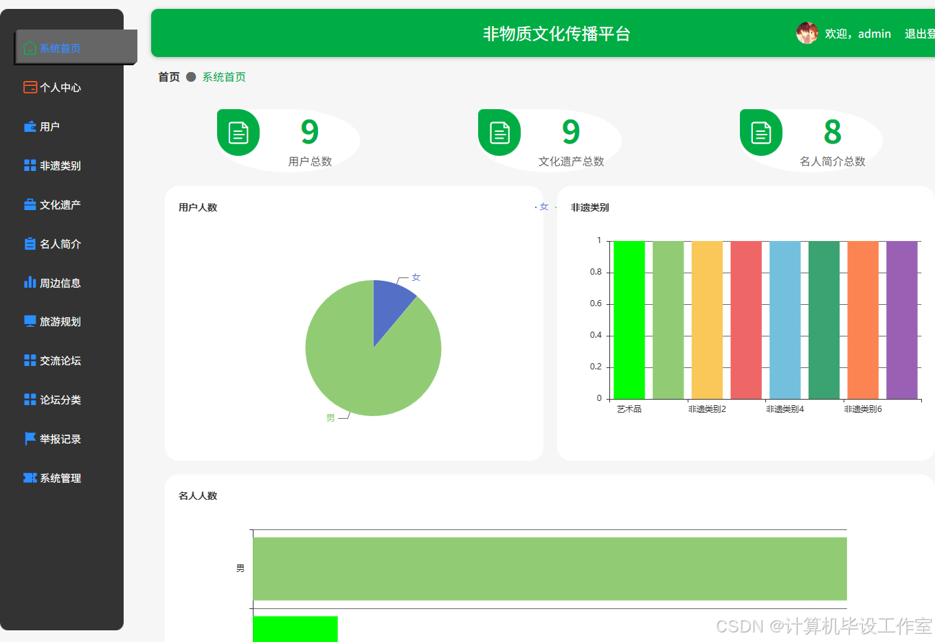 2.系统管理员的主要功能有登录、用户管理、非遗类别管理、文化遗产管理、名人简介管理、周边信息管理、旅游规划、交流论坛管理、论坛分类、举报记录管理、系统管理等。
