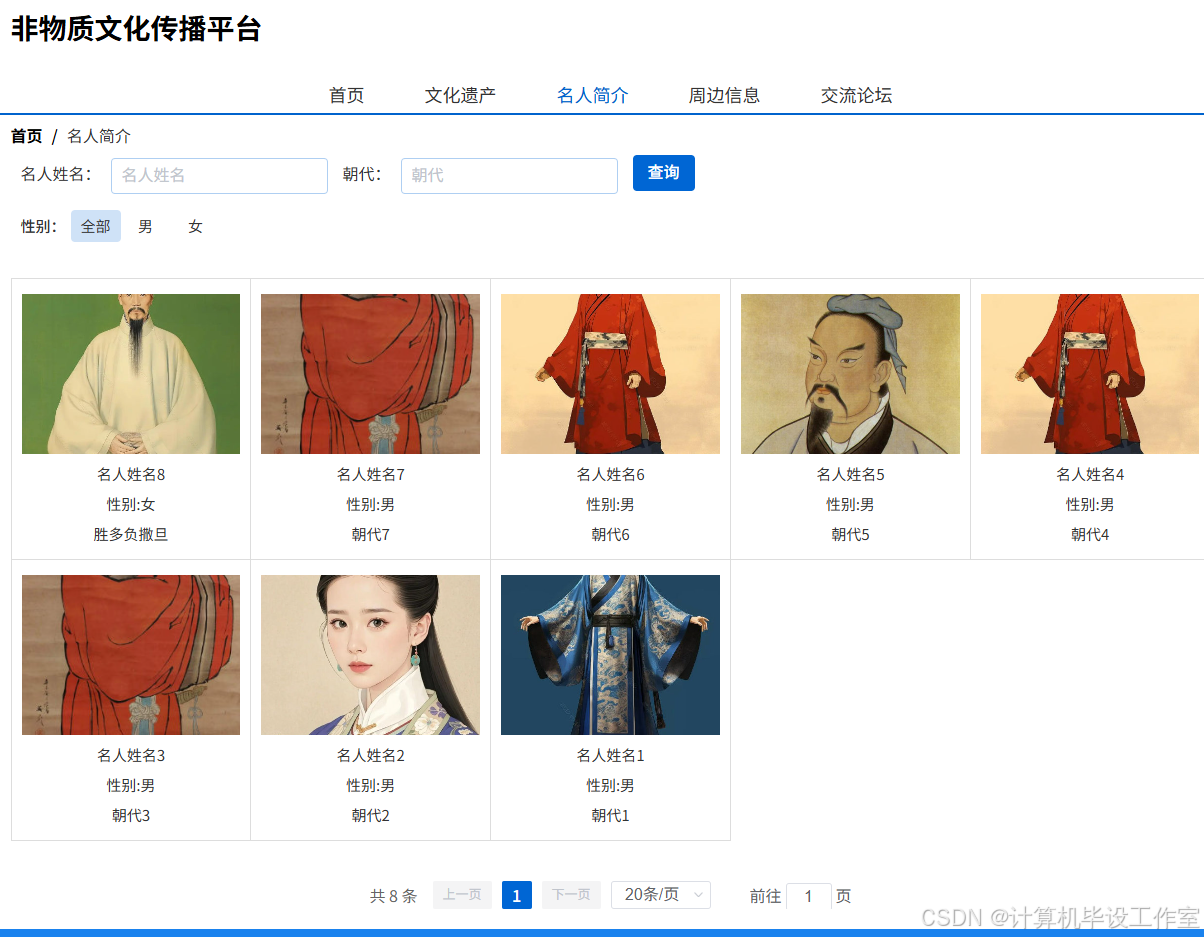 (4)名人简介:发布和展示名人信息,包括具体的朝代、风格和个人简介。