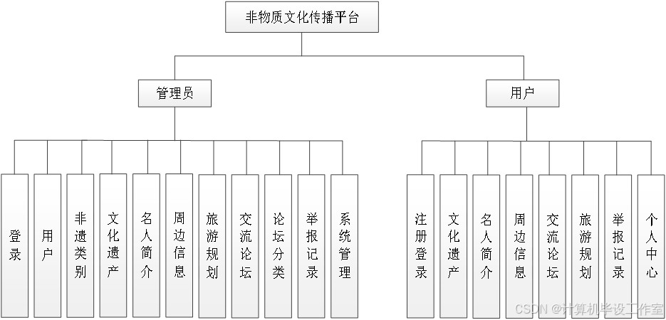 非物质文化传播平台主要划分了前台用户和系统管理员2个角色。