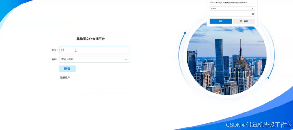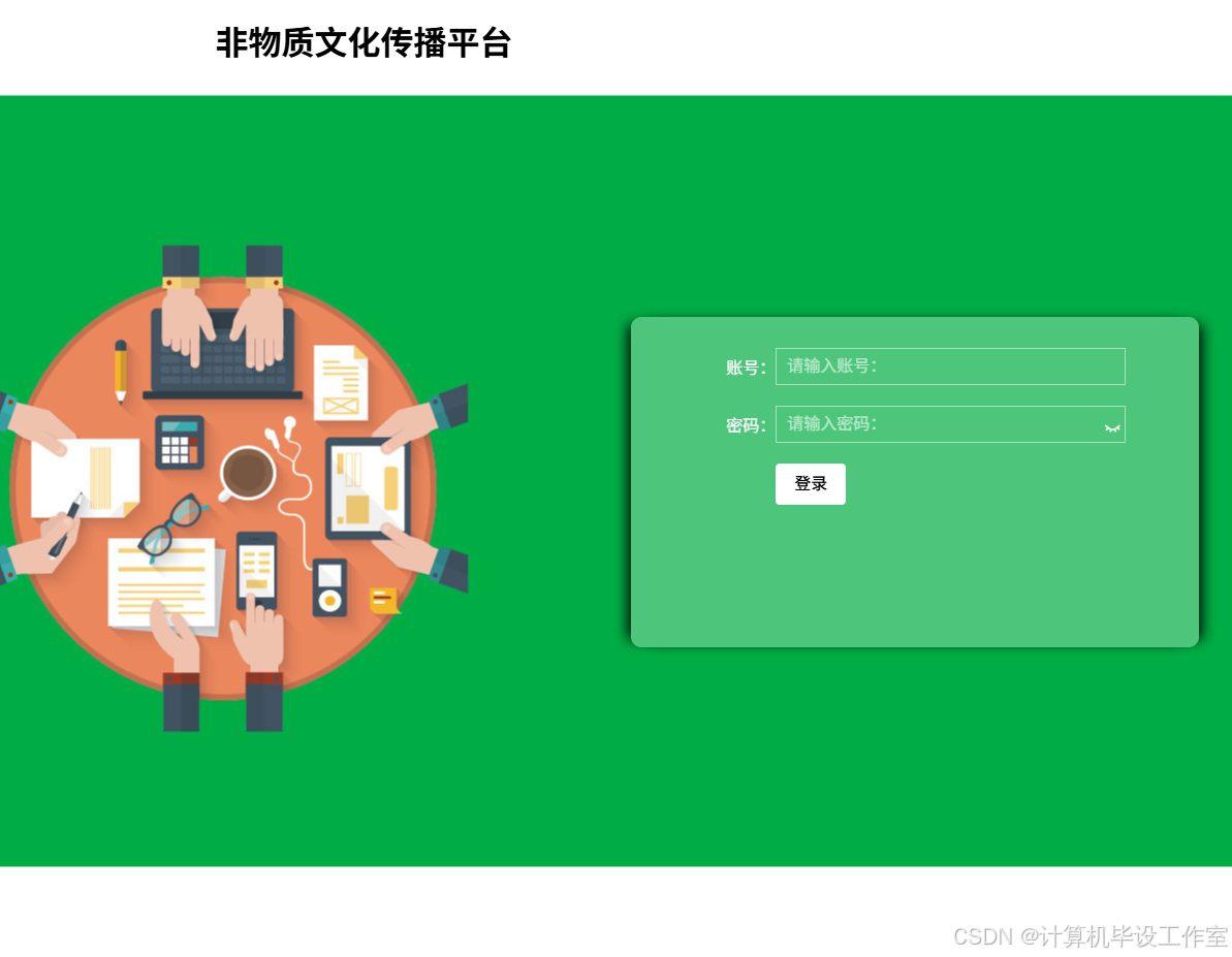 非物质文化传播平台中的用户注册完成后可以凭用户账号以及密码进行登录,账户以及密码信息会传送到系统中进行识别认证,账户以及密码正确方可成功登录系统,否则会提示异常信息,用户登录界面如下图5-3所示。