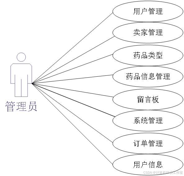 系统中的核心用户是系统管理员,管理员登录后,通过管理员菜单来管理后台系统。主要功能有:用户管理、药品类型、药品管理、卖家管理、留言板、系统管理、订单管理等功能。管理员用例如图3-7所示。