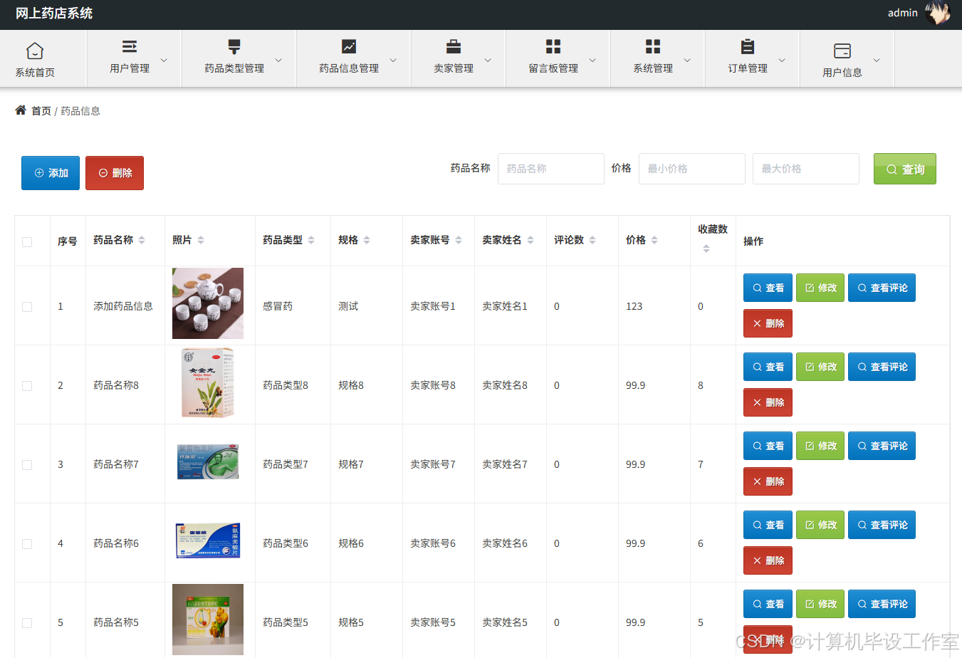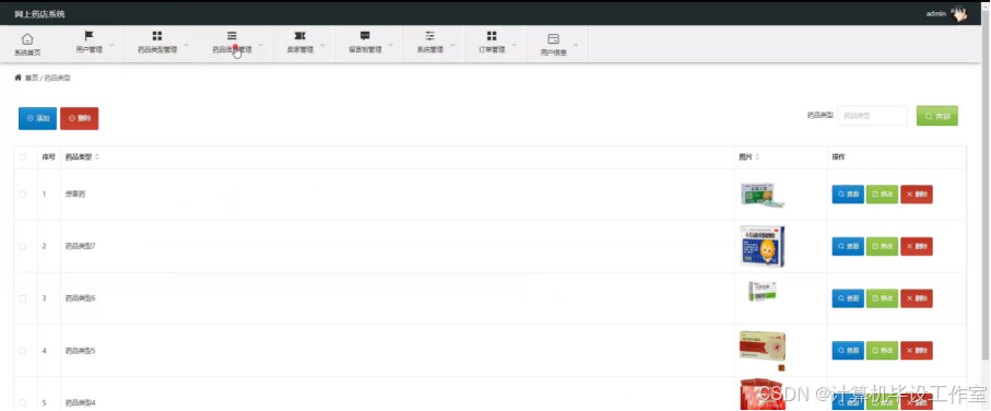 药品信息管理,在药品信息管理页面中可以对每一类的药品信息进行增删改查,如图5-10所示。