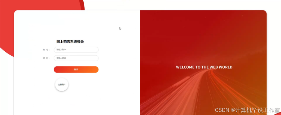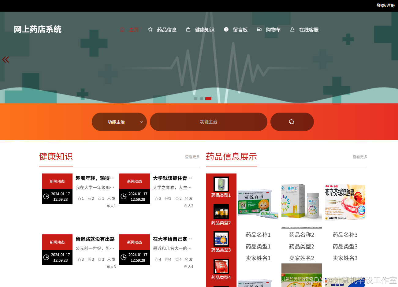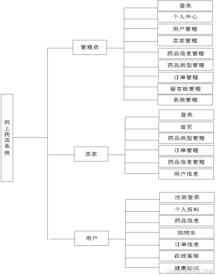 (1)用户进入系统进行注册登录、浏览药品信息以及下单、购物车、留言板、健康知识、在线客服咨询、我的订单功能等。