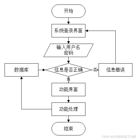 用户打开并进入系统后,会先显示登录界面,输入正确的用户名和密码,系统自动检测信息,若信息无误,则用户会进入系统功能界面,进行操作,否则会提示错误无法登录,操作流程如图3-3所示。