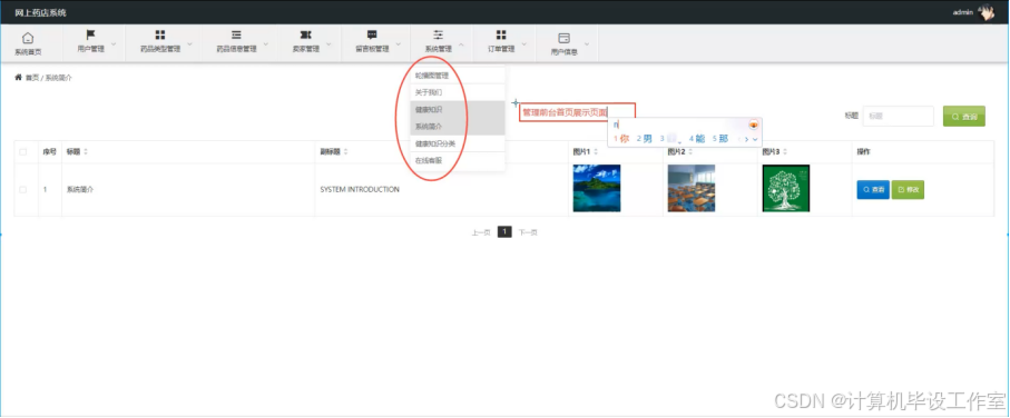 系统管理,该页面分为以下信息的管理,分别是轮播图、关于我们、健康知识、系统简介、在线客服等。如图5-12所示。
