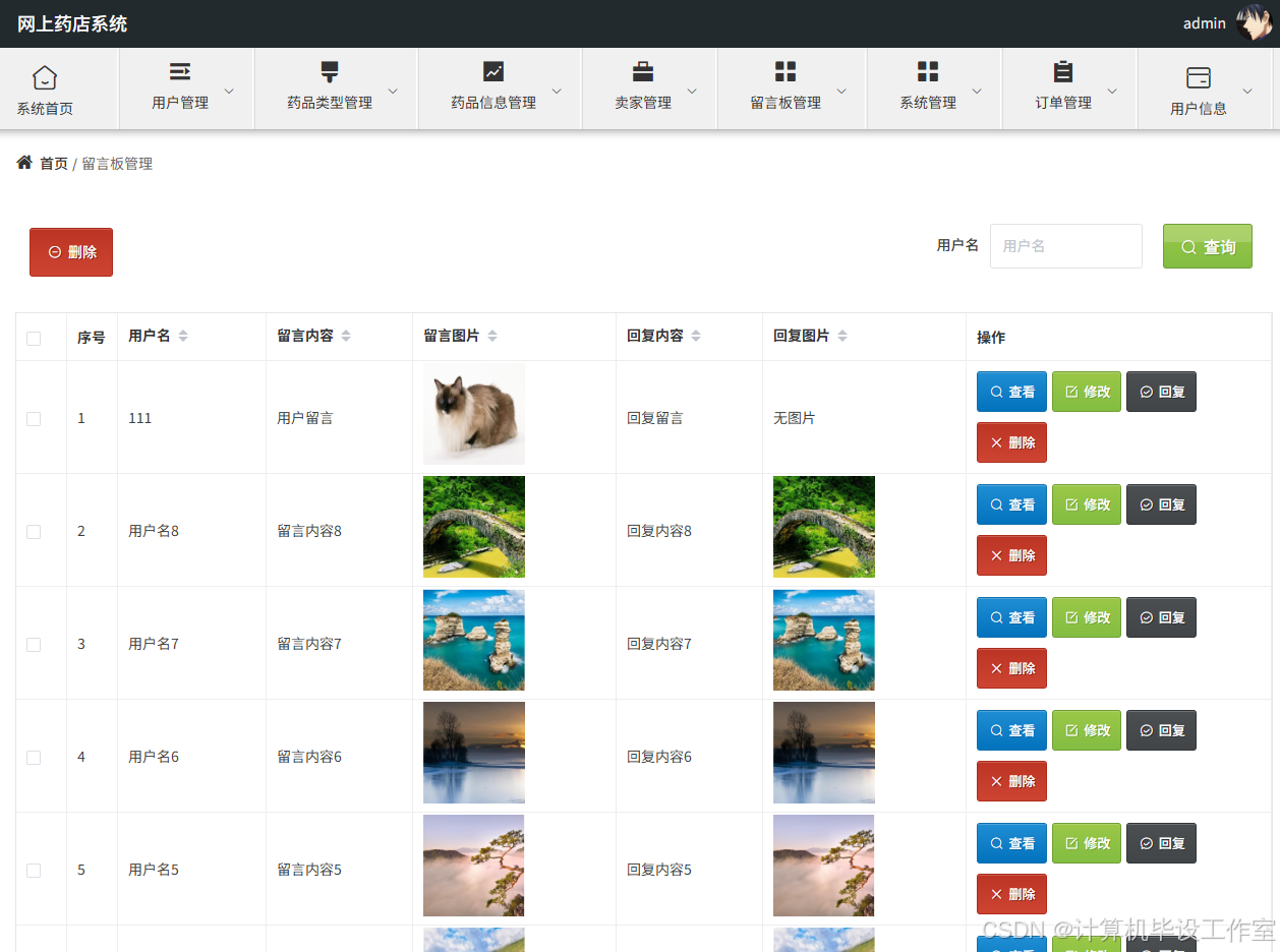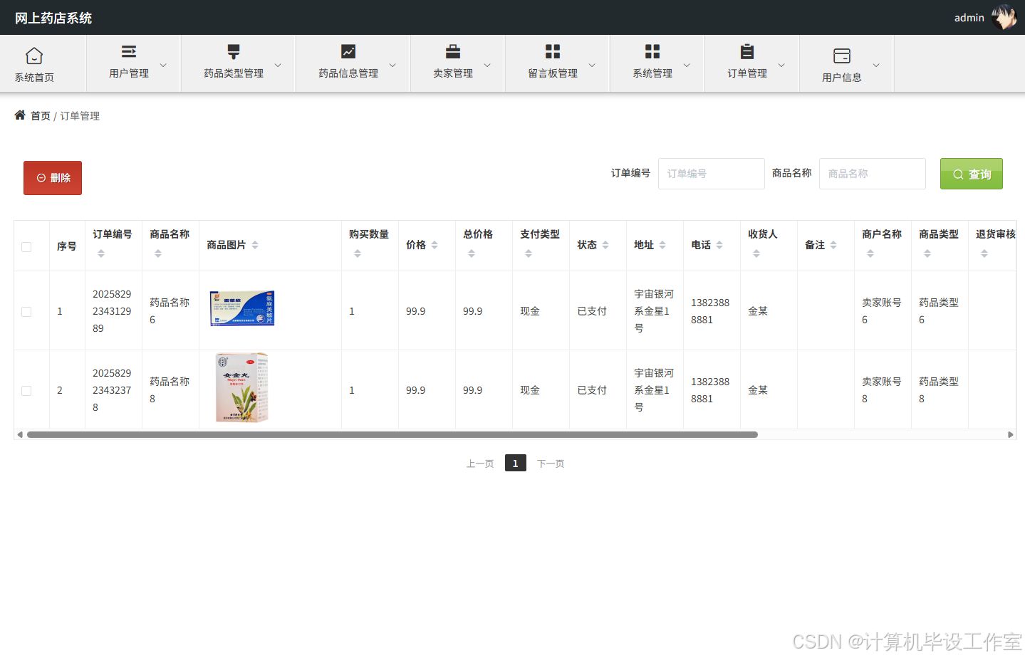 (3)管理员登录后主要功能有:用户管理、药品类型、药品管理、卖家管理、留言板、系统管理、在线客服回复、健康知识管理、订单管理等功能。