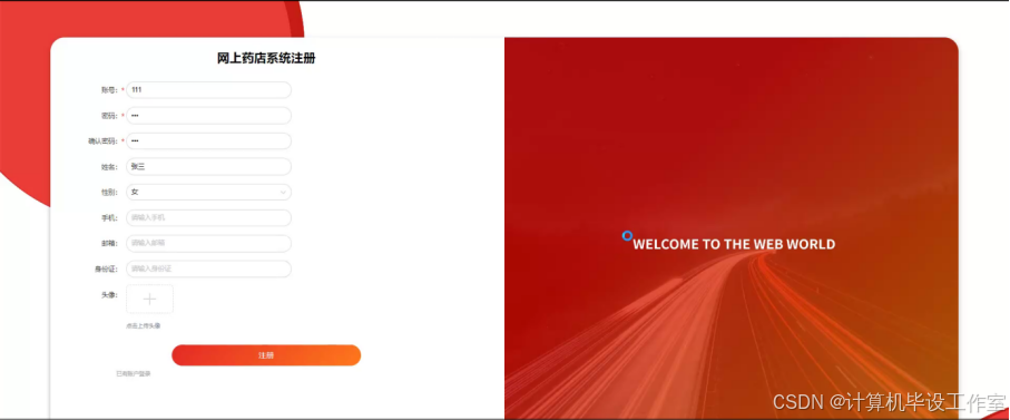 用户注册,在用户注册页面可以填写账号、密码、昵称、邮箱、手机号码、身份、性别、身份证号码等详细内容进行注册,如图5-2所示。
