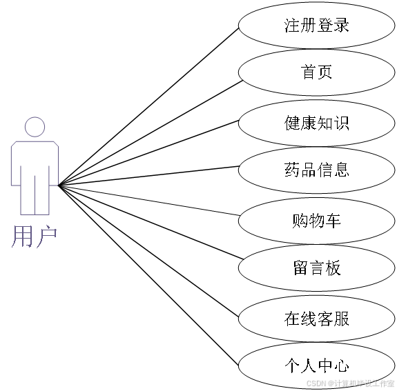 用户进入系统拥有注册登录、药品信息、购物车、留言板、在线客服、我的订单功能等。用户用例如图3-8所示。