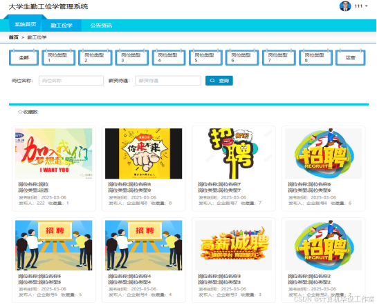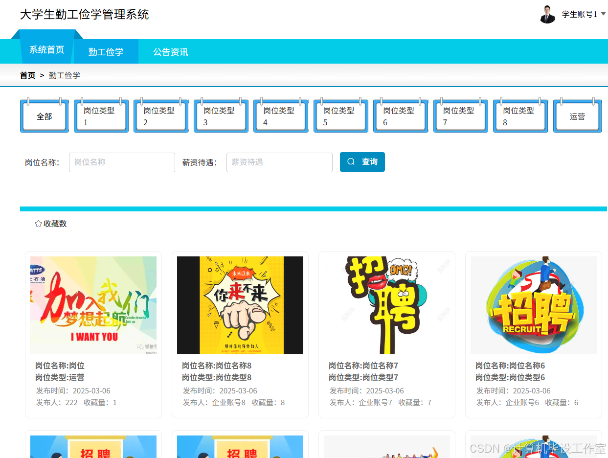 招聘首页的核心功能是展示可供选择的勤工俭学岗位,系统设计注重用户体验,保证页面布局合理且信息展示全面,包括岗位名称、工作内容、薪酬范围以及申请按钮等,首页设有搜索和过滤功能,能让学生依据兴趣或专业迅速找到适宜的岗位,系统首页采用响应式设计,可适配各类屏幕尺寸,在不同设备上可给予良好的浏览体验,如图5.9所示【10-12】。