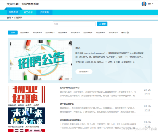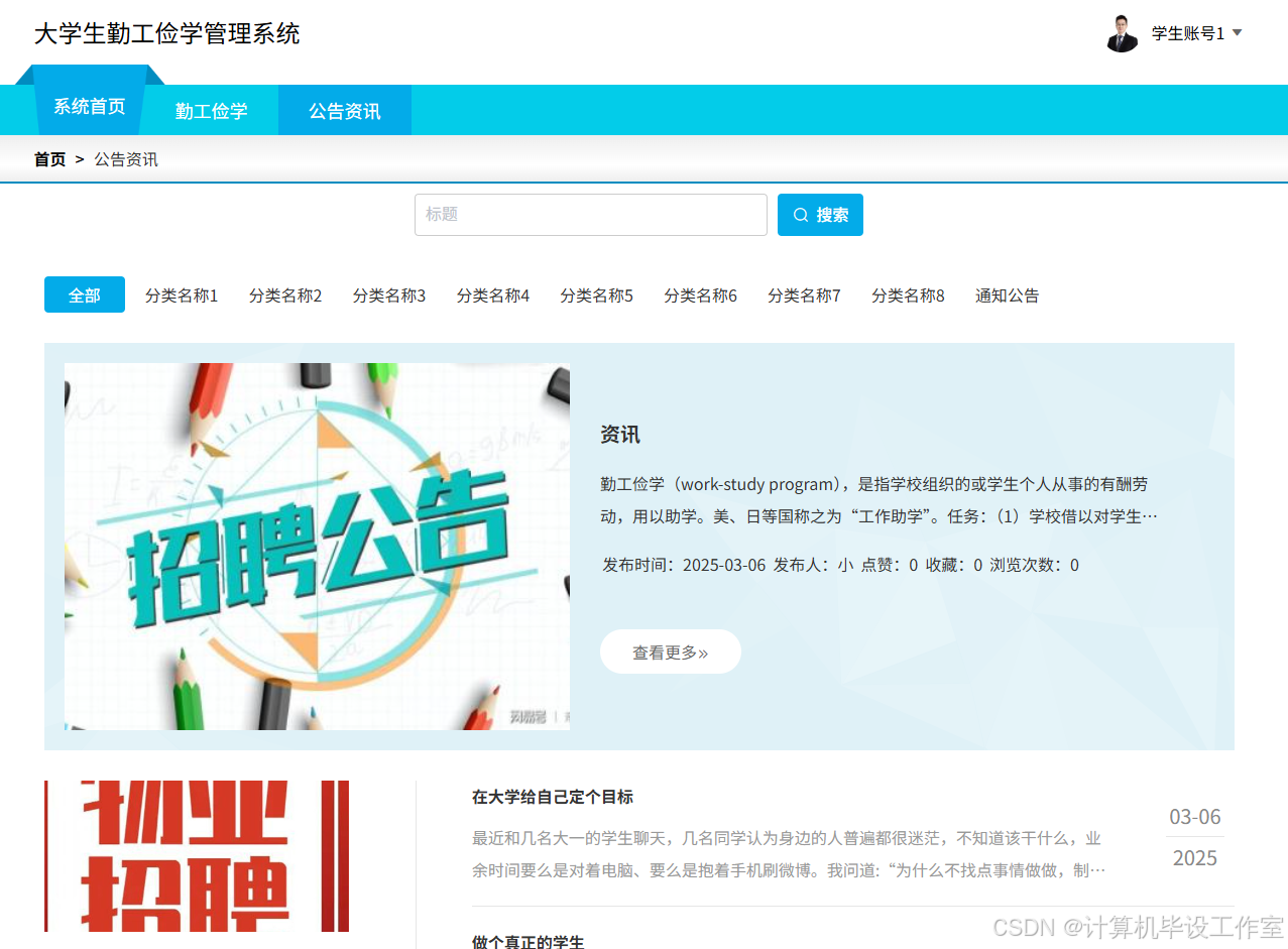 客户端公告页面会展示出最新的公告信息,学生借助该页面可迅速了解到最新的勤工俭学状况,公告页面还有分类查看的功能,学生可依据公告类型来筛选信息,快速定位到自己所需的内容并选中心仪的工作。如图5.10所示。