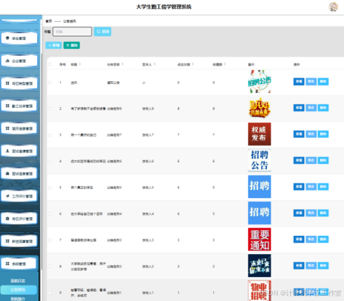 呈现的是系统里的公告信息管理页面,此页面使得系统管理员可增添公告,用以向学生通告有关勤工俭学的信息,还可对已发布的公告给予修改,实现信息的更新或者纠正,也可将过时的或者不再需要的公告给予删除,这保证了学生可及时获取到最新且准确的勤工俭学相关通知,提升了信息传达的效率以及准确性,如图5.2所示。