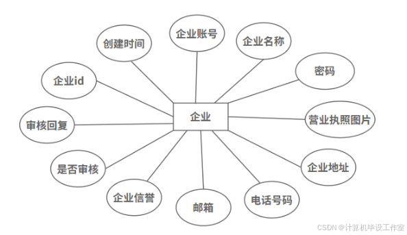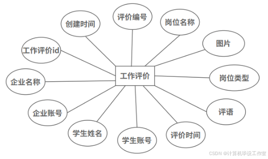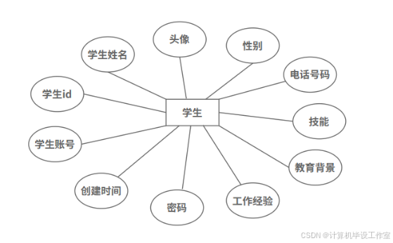 (2)学生身为系统的核心服务对象,学生实体用以记录以及管理学生的基本信息、技能、教育背景、工作经验等内容,可学生参与岗位申请、面试、评价等勤工俭学活动,方便企业知晓学生状况,推动学生与企业之间达成有效对接。图4.5展示了学生实体及其对应属性。