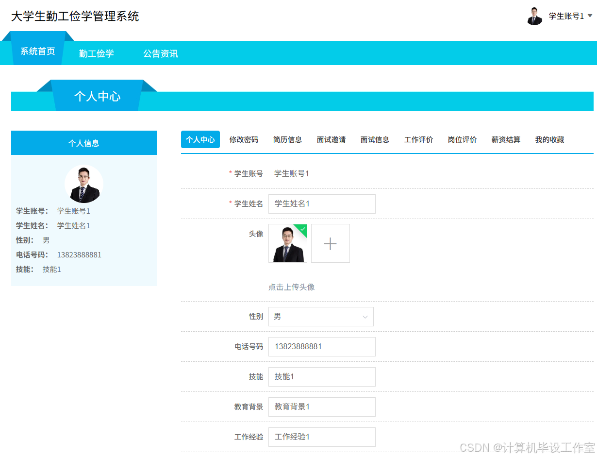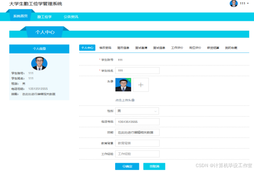 大学生勤工俭学管理系统里的客户端个人中心是专门为学生用户打造的核心功能部分,在这个个人中心之中,学生可查看自身基本个人资料,还可对联系方式、教育背景以及工作经验等关键信息给予更新,系统也准许学生上传并修改简历,以此便于应聘校园内外的勤工俭学职位,该平台借助Spring Boot框架开发,凭借提供一站式服务,便利了学生的日常管理,还提升了职位匹配的效率与精确度。如此设计让系统符合了学生实际需求,又优化了校园工作资源的整体管理,如图5.11所示。