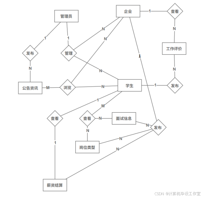为全面展示大学生勤工俭学管理系统中的核心数据结构及其业务逻辑联系,首先构建系统的总体E-R图。该图直观反映了各核心实体(如管理员、学生、学校、企业、岗位、简历等)之间的关联结构,如一对多、多对多等,揭示了系统运行中的关键数据流与管理路径(见图4.3)。通过该E-R图,可为后续的概念结构设计与逻辑结构设计提供全局框架支撑[5]。