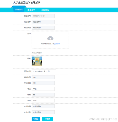 摘要:随着高校学生勤工助学活动的不断推进,传统人工管理模式已难以满足信息处理效率与管理规范化的双重需求。本文设计并实现了一套基于Spring Boot框架的大学生勤工俭学管理系统,旨在提升勤工助学事务的处理效率与信息化水平。系统采用SSM(Spring、Spring MVC、MyBatis)架构,结合MySQL数据库,构建前后端分离、结构清晰、模块独立的应用体系。开发过程中通过系统可行性分析、性能指标定义与功能需求建模,明确系统目标与实现路径,并以三类角色(管理员、学生、企业)为核心设计业务模块。系统功能涵盖岗位信息发布、学生报名、薪资结算、公告通知等多个方面,有效解决了数据分散、权限混乱、流程不清等问题。测试结果表明,该系统具有良好的稳定性、安全性与扩展性,能够显著提升高校勤工助学事务的数字化处理能力,对高校信息化管理的推进具有较强的实践意义和推广价值。