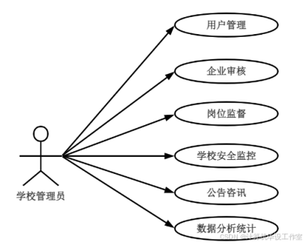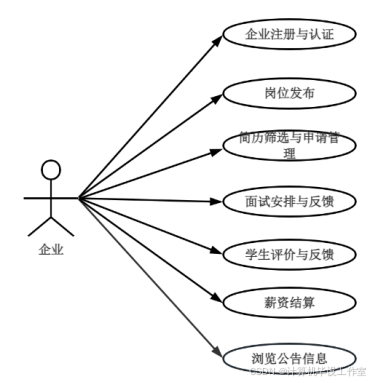 系统功能分析是整个系统开发的重要前置环节,通过对各类用户角色的操作行为进行建模,可更清晰地理解其在系统中的功能定位与业务流程。本系统以学生、企业、管理员三类角色为核心,结合实际操作场景,设计了相应的功能用例图。