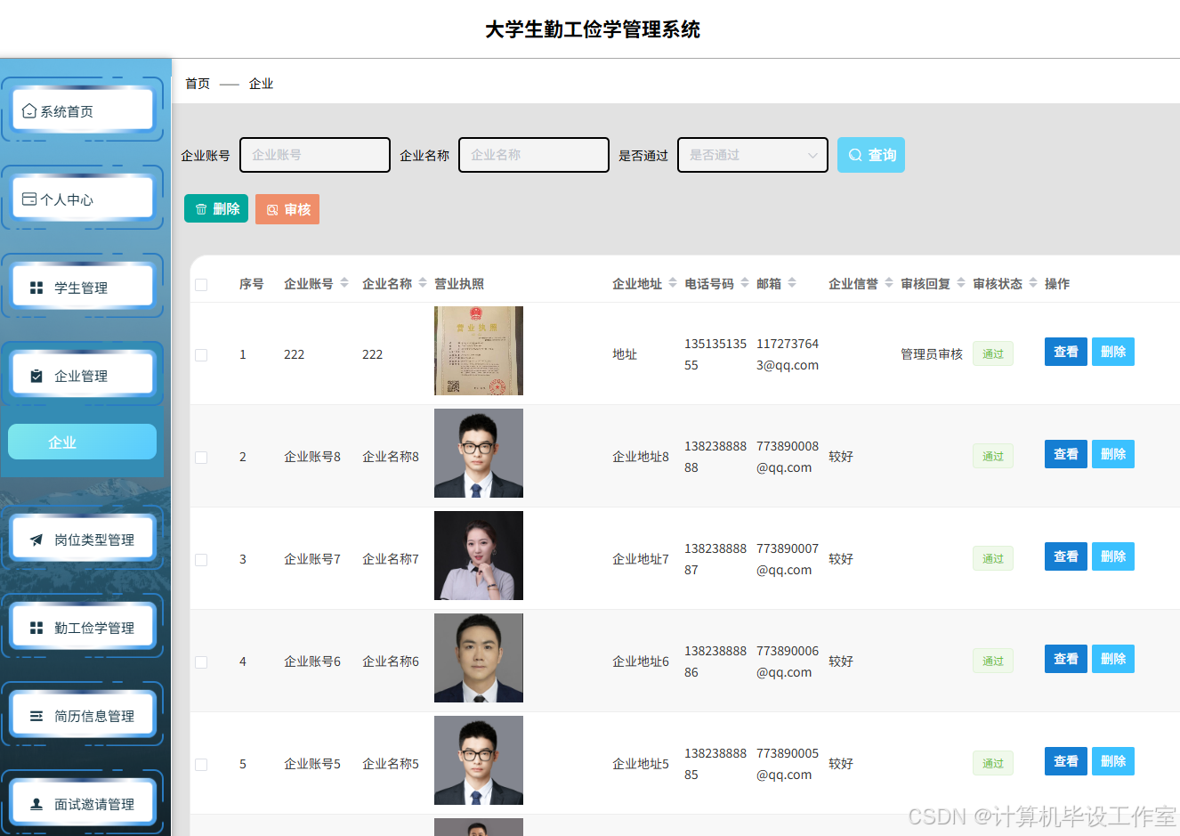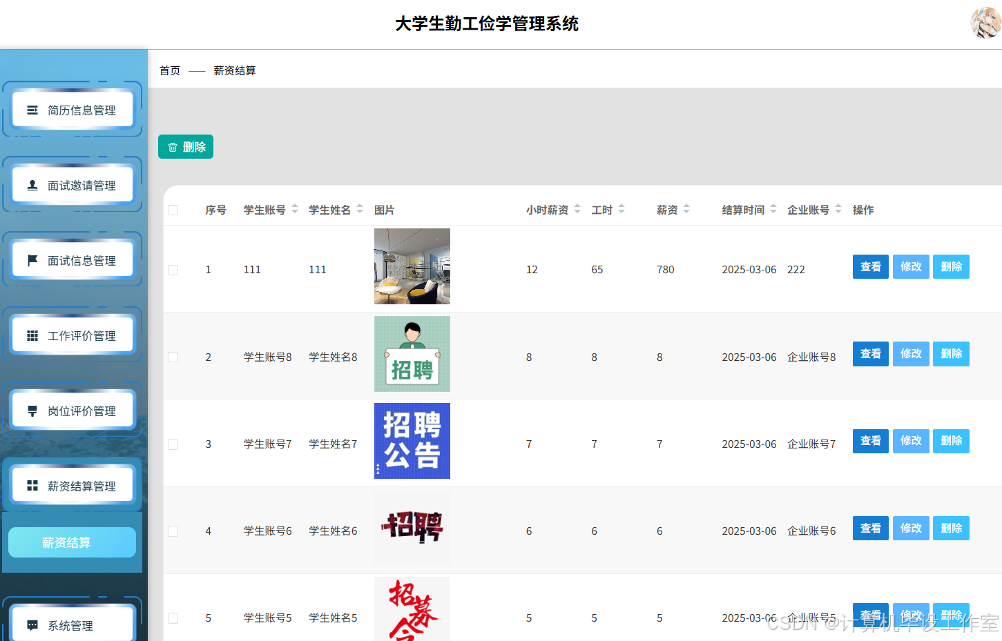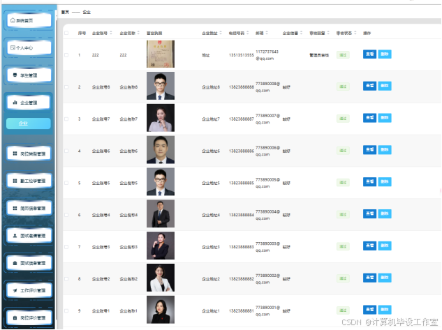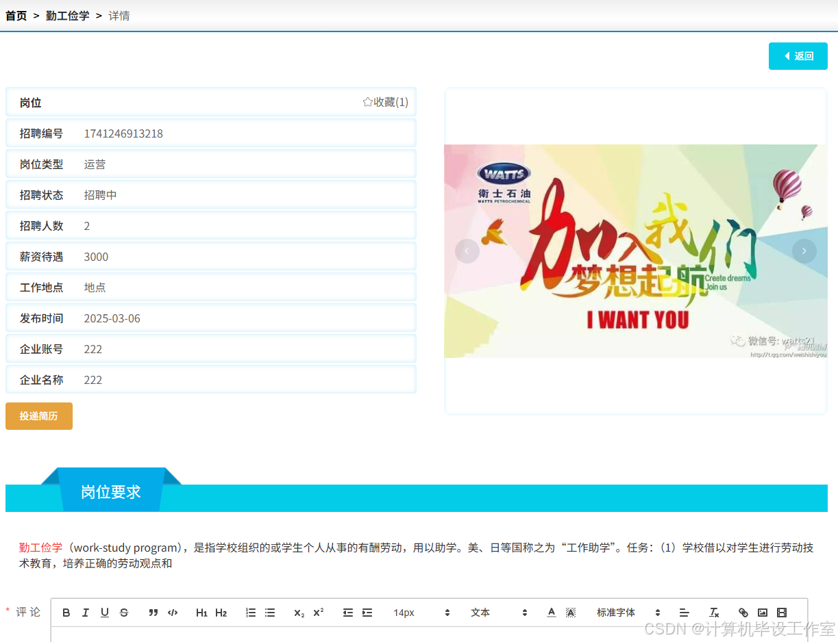 企业用户主要负责发布岗位需求、筛选应聘者以及进行薪资结算。系统为企业端配备了面试管理、岗位编辑、公告发布等功能,构建起完整的校园招聘流程闭环。