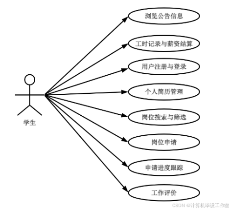 (1)学生作为系统的主要使用者,主要关注岗位获取、简历投递与个人信息管理等功能。系统为学生用户提供了岗位浏览、简历管理、薪资查询等操作入口,确保其能够高效地完成从岗位筛选到工作结算的全过程。