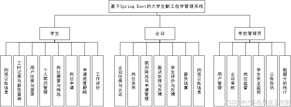 在明确系统用户需求的基础上,系统功能结构设计阶段重点体现各模块之间的逻辑关联与整体架构的清晰性。本系统基于Spring Boot框架进行开发,采用模块化设计思想,通过分角色管理实现系统功能的精细划分,便于后续开发与维护,增强系统的可扩展性和稳定性。系统主要分为三类角色:管理员端、学生端、用工单位端,各角色在系统中承担不同职责,功能模块划分如下: