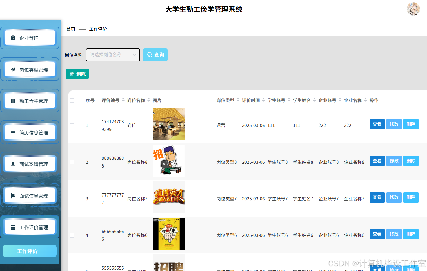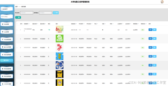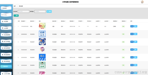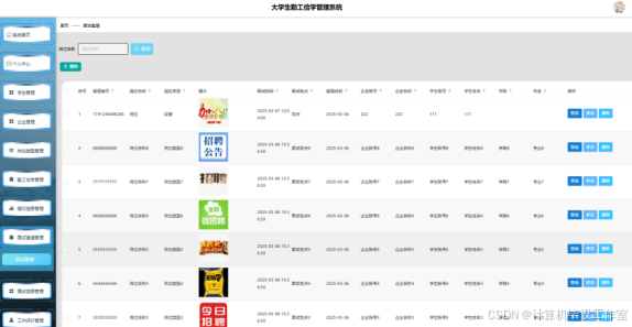 此页面能让系统管理员查看当下已有的职位招聘信息,还可以新增职位,对职位详情进行编辑或者更新,也可把不再需要的职位删除,此系统是依据Spring Boot框架开发而成,目的在于优化校园勤工俭学职位的管理流程,提升管理效率以及用户体验,如图5.1所示。