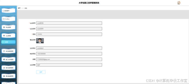 企业信息模块主要发挥着让用工单位对本部门基本资料给予维护更新的作用,其覆盖的内容有单位名称、联系方式、单位简介、封面图片以及账户登录信息等,借助此模块,企业可随时对对外展示的信息作出调整,以此保证岗位发布有可信度以及信息保持一致性,系统在数据录入环节设置了字段校验机制,以此避免出现格式错误或者信息缺失的情况,提升数据的准确性。该模块为企业开展岗位招聘、面试安排等操作提供了基础数据方面的支持,同时也是管理员开展单位审核与管理工作的一项重要依据之一,如图5.4所示。