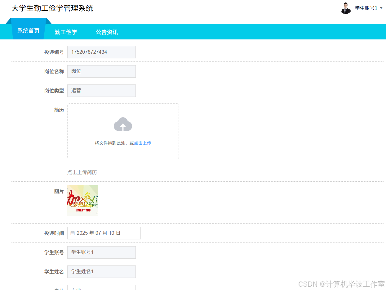 随着参与勤工助学的学生人数持续增多,信息处理要求变得日益繁杂,迫切需要借助现代信息技术达成系统化以及智能化管理,Spring Boot作为一种高效且便捷的后端开发框架,拥有快速构建独立部署系统的能力,适合构建结构清晰、性能稳定的Web应用,基于Spring Boot的大学生勤工俭学管理系统可达成岗位信息发布、学生报名管理、工时统计、工资结算等功能的自动化,还可借助数据库集成与权限管理机制,保障数据传输与存储的安全性。通过引入模块化开发思想与前后端分离架构,该系统具有不错的可扩展性和可维护性,可切实提升管理效率,优化高校人力资源配置,推动大学生勤工助学工作朝着信息化、规范化方向发展,充分发挥计算机技术在校园管理中的支撑作用。